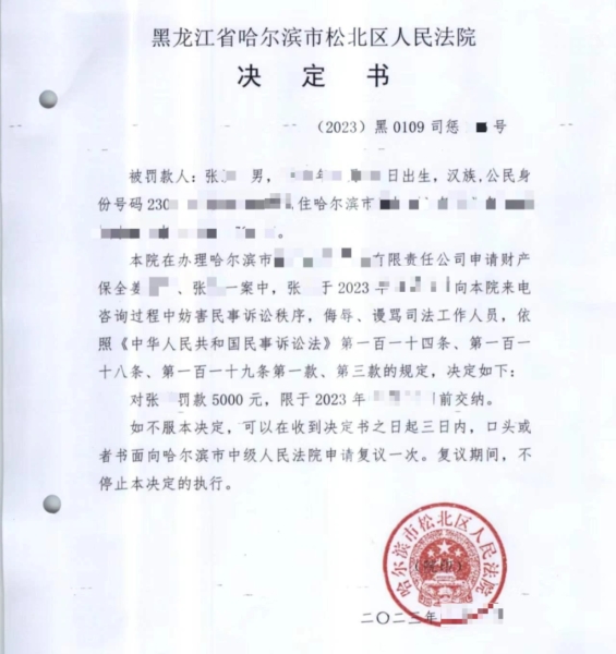 辱骂执行干警、公然挑衅司法权威这样真的会被依法严惩。近日,松北区法院、宾县法院对严重干扰司法秩序的当事人予以处罚。“喂,你们为什么把我的微信和银行账户冻结了!你们有什么权利!你这个XXX!”电话中情绪激动、满口脏话的男子是松北区法院一起执行案件被执行人张某。在审理某贷款公司与姜某、张某借款合同纠纷一案中根据贷款公司提出的财产保全申请法院依法冻结了姜某和张某名下银行及网络资金账户内存款得知自己的银行账户被冻结。张某打来电话在接到张某电话质问时法官耐心安抚张某情绪,多次试图向其释法明理并严肃告诫其停止辱骂,否则将依法对其严惩,可张某不仅置之不理还变本加厉辱骂法官。污言秽语不堪入耳并扬言“我倒要瞧瞧你们法院能怎么样我!”对于这种肆意辱骂法院干警挑衅司法权威的恶劣行为,法官充分考虑案件实际情况与张某的行为性质依法决定对张某罚款5000元。收到处罚决定书后张某立即向上级法院提出复议申请,并一改之前的嚣张态度完全否认自己有过辱骂法官的行为。妄图逃避处罚法院是国家司法机关每个人在法院的诉讼行为都将被完整记录。张某在电话中的一字一句早已被清晰的记录在通话录音中鉴于事实清楚、证据充分。哈尔滨中院驳回了张某的复议申请,维持了松北区法院的处罚决定。在法律的威慑和无可辩驳的事实面前张某最终认识到了自己的错误,主动联系法官表达歉意并全数缴纳罚款。