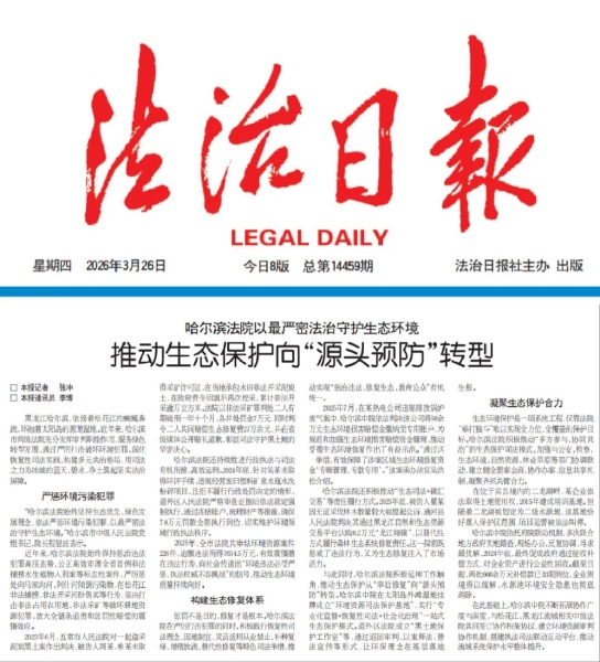 法治日报 | 哈尔滨法院以最严密法治守护生态环境,推动生态保护向“源头预防”转型 发布时间:2026-03-26 15:51:32